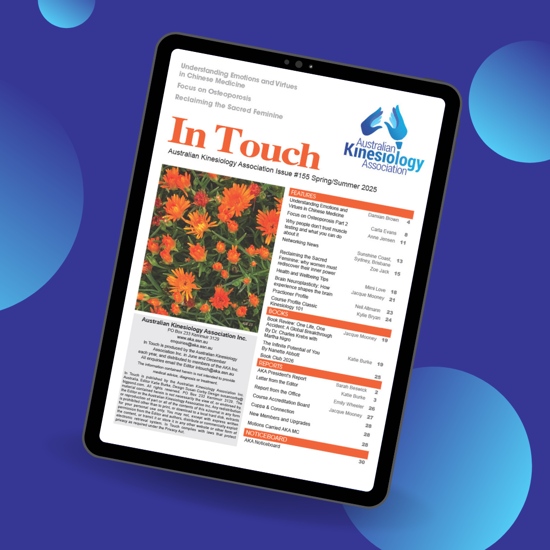 In Touch is an exclusive digital magazine that brings you the latest in kinesiology developments, news and events. Published bi-annually, the magazine is an invaluable resource for our members and avenue for advertising for the wider community.